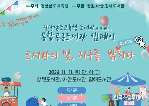 한국소통투데이 관리자 기자 | 경상남도교육청은 11월 11일 창원도서관, 마산도서관, 김해도서관에서 ‘도서관의 빛, 지구를 밝히다’라는 주제로 경남교육청 통합공공도서관 캠페인을 연다.