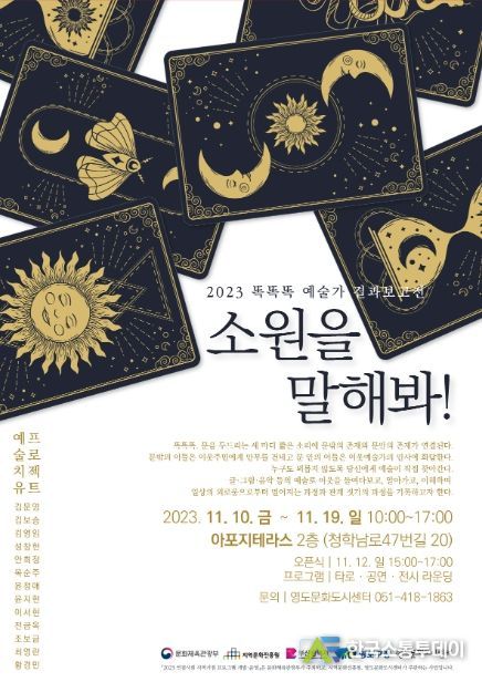 한국소통투데이 관리자 기자 | 영도문화도시센터(센터장 고윤정)는 오는 11월 10일부터 19일까지 영도 청학동 아포지테라스(청학남로47번길 20)에서 똑똑똑 예술가 결과보고전 '소원을 말해봐'를 개최한다.