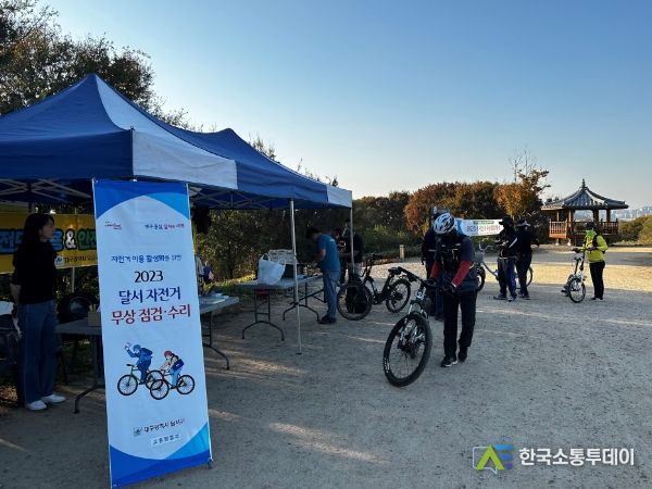 달서구는 자전거 이용 활성화를 위하여 10월 30일(신당네거리), 31일(상인네거리), 11월 1일(죽전네거리), 2일(대명유수지) 4일간 자전거 통행량이 많은 장소에서 자전거 무상점검 및 수리 행사를 실시했다.