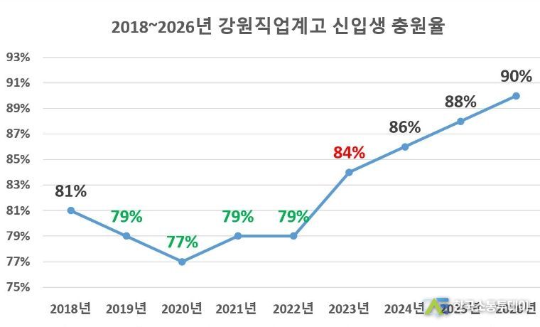 강도 높은 직업계고 재구조화를 통한 궁극적 목표는 단 하나, ‘신입생 충원율’이다. 직업교육 관련 모든 활동들(재구조화/교육과정/취업지원/입학홍보/환경개선 등)의 총체적 결과가 ‘학생들이 직업계고를 선택하는가?’로 귀결되기 때문이다. 이러한 측면에서 강원직업계고의 신입생 충원율 지표는 급반등하고 있다. 신입생 입학 연도별 충원율을 살펴보면 2018년 81% → 2019년 79% → 2020년 77% → 2021년 79% → 2022년 79%로 70%대에 머물던 충원율이 2023년 84%로 5년 만에 80% 저항선을 돌파했기 때문이다. 도교육청은 이에 만족하지 않고 더 과감한 지원과 혁신적 노력을 통해 2024년 86%, 2025년 88%, 2026년 90%를 목표로 교육감 임기 내 90% 이상 달성하는 로드맵을 제시하고 있다.