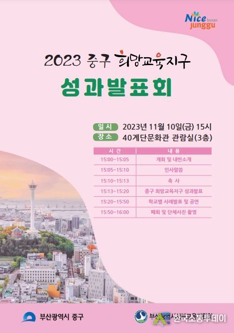 한국소통투데이 관리자 기자 | 부산광역시서부교육지원청과 중구는 10일 오후 3시 중구 40계단문화관 3층 관람실에서 ‘2023 중구희망교육지구 성과발표회’를 개최한다.