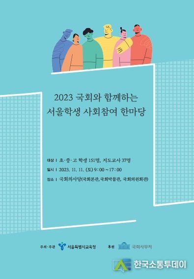 서울특별시교육청은 11월 11일 9시부터 17시까지 국회의사당에서 ‘2023 국회와 함께하는 서울학생 사회참여 한마당’을 개최한다. 이번 행사는 서울특별시교육청이 중점적으로 추진하는 4대정책인 ‘국(국제공동수업)‧토(토론교육)‧인(인공지능활용 교육)‧생(생태전환교육)’ 가운데 토론교육 프로그램의 일환으로 마련됐다.