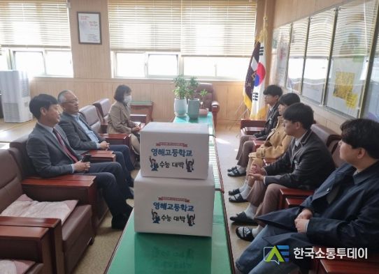 한국소통투데이 관리자 기자 | 경상북도영덕교육지원청은 11월 8일 금요일 관내 영덕고등학교 외 2개 학교를 찾아 대입 수험생 대표학생과 학교 관계자들을 따뜻하고 정감있게 응원하고 수능 시험장의 설치, 운영 전반을 점검했다.