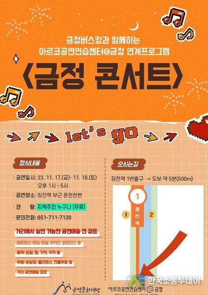 한국소통투데이 관리자 기자 | 부산 금정구 금정문화재단은 오는 17일부터 18일까지 이틀간 아르코@금정 연계프로그램 '금정콘서트'를 개최한다고 밝혔다.