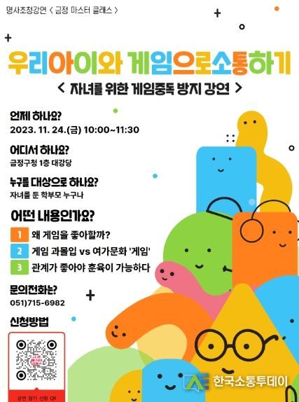 한국소통투데이 관리자 기자 | 부산 금정구 금정문화재단이 오는 24일 오전 10시에 금정구청 대강당에서 '금정 마스터 클래스' 사업의 일환으로 게임 과몰입 방지 강연‘우리 아이와 게임으로 소통하기’를 개최한다.