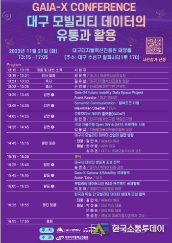 한국소통투데이 관리자 기자 | 대구광역시는 모빌리티 데이터 산업 활성화를 위해 대구시-독일 DLR(독일 항공우주센터)-한국자동차연구원이 공동 주최하고 대구디지털혁신진흥원이 주관하는 ‘국제 데이터 세미나’를 오는 21일(화)에 개최한다.