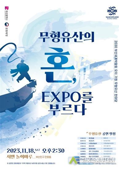 한국소통투데이 관리자 기자 | 부산시는 오는 11월 18일 오후 2시 30분 서면 놀이마루에서 2030부산세계박람회 유치를 기원하는 '무형유산 한마당' 행사를 개최한다고 밝혔다.
