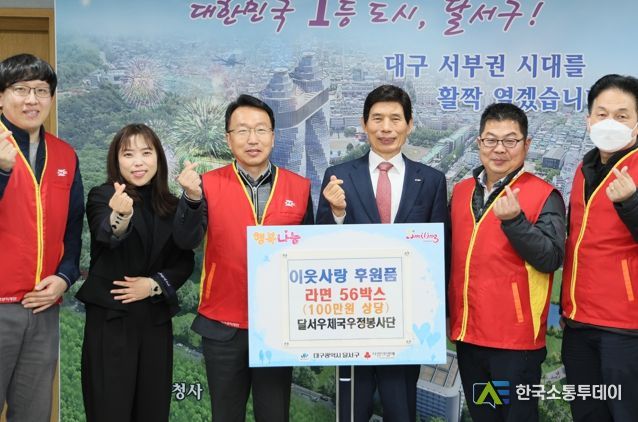 한국소통투데이 관리자 기자 | 대구 달서구는 지난 14일 대구달서우체국 우정사회봉사단으로부터 라면 56박스(환가액 100만원 상당)를 기탁받았다.