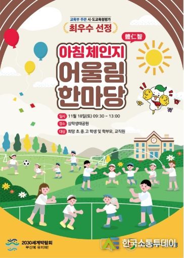부산광역시교육청(교육감 하윤수)은 18일 오전 9시 30분 사상구 삼락생태공원 일대에서 부산지역 학생, 학부모, 교직원 등 2,800여 명이 함께하는 ‘아침체인지(體仁智) 어울림 한마당’ 행사를 개최한다고 17일 밝혔다.