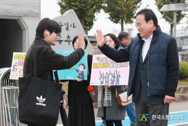 서거석 교육감은 이날 오전 7시 30분부터 30여 분간 전주 전라고등학교 앞에서 시험을 치르기 위해 학교 안으로 들어가는 수험생들을 맞이하며 “마지막까지 최선을 다해달라”고 응원했다.