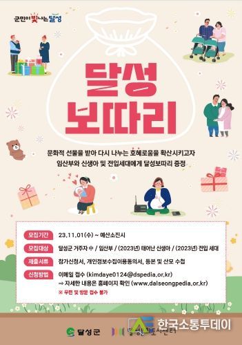 한국소통투데이 관리자 기자 | 달성문화도시센터는 달성문화도시의 비전인 ‘호혜로움’을 실천하고자 달성군 군민과 미래 달성 군민들을 포용하고 환대하는 ‘달성보따리’ 사업을 펼친다고 밝혔다. 본 사업은 2023년 기준 달성군 거주 임산부 및 산모와 신생아, 달성군 전입세대를 대상으로 진행된다.