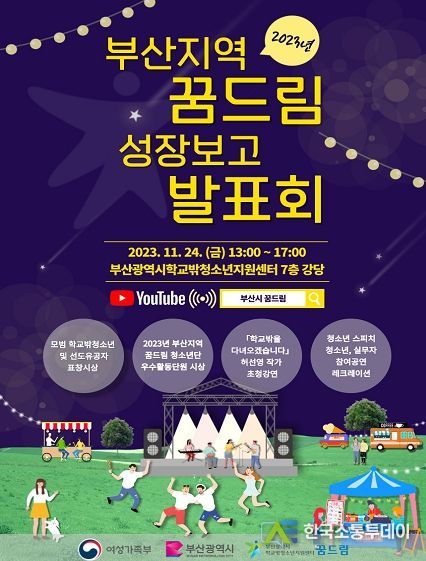 한국소통투데이 관리자 기자 | 부산시는 오는 11월 24일 오후 1시 부산시 학교 밖 청소년지원센터 대강당에서 '2023년 부산지역 꿈드림 성장보고회'를 개최한다고 밝혔다.