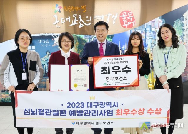한국소통투데이 관리자 기자 | 대구시 중구는 17일 2019년 이후 4년 만에 열린 2023년 대구광역시 심뇌혈관질환예방관리사업 성과공유회에서 2023년 심뇌혈관질환예방관리사업 성과 평가 결과 최우수상을 수상했다.