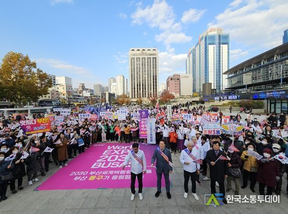 한국소통투데이 관리자 기자 | 부산 동구는 11월 27일 부산역 광장에서 '2030 부산세계박람회 유치 염원 결의대회'를 개최했다. 2030 세계박람회 개최도시 최종발표일을 하루 앞두고 동구민의 염원과 의지를 결집하기 위한 이번 행사는 부산역 광장을 함성으로 가득 채웠다.