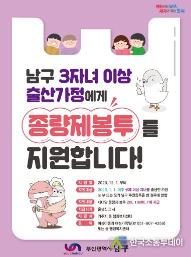 한국소통투데이 관리자 기자 | 부산 남구는 아이 키우기 좋은 남구를 만들기 위해 12월 1일부터 3자녀 이상 출산하는 가정에 종량제봉투 20L 100매를 무상 지원하는 사업을 시행한다.