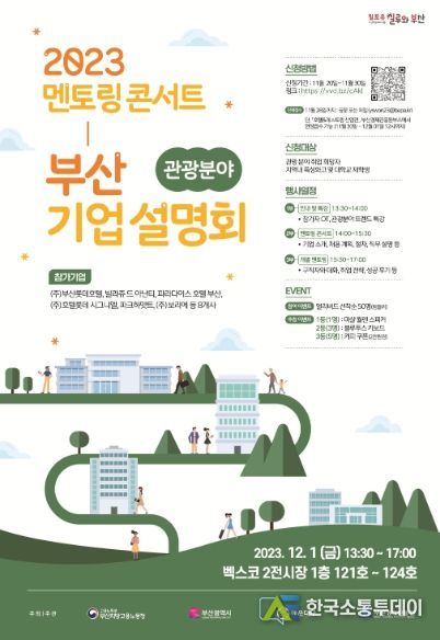 한국소통투데이 관리자 기자 | 해운대구(구청장 김성수)는 부산경제진흥원과 함께 12월 1일 오후 1시 30분~오후 5시 벡스코 제2전시장에서 ‘2023 멘토링 콘서트, 부산 관광 분야 기업 설명회’를 개최한다.