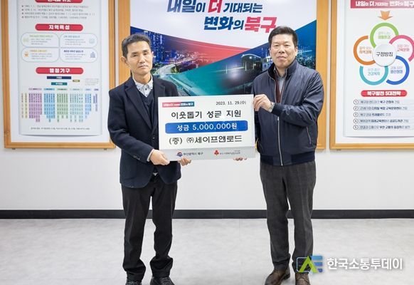 한국소통투데이 관리자 기자 | 부산 북구는 지난 29일 ㈜세이프앤로드(대표 최경희)에서 구청을 방문하여 저소득 취약계층에게 따뜻한 나눔을 전하고 싶다며 성금 5,000,000원을 기탁했다고 밝혔다.