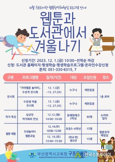 한국소통투데이 관리자 기자 | 부산광역시립구포도서관은 12월 한 달간 ‘웹툰과 도서관에서 겨울나기’행사를 운영한다.
