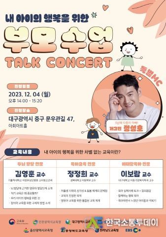 한국소통투데이 관리자 기자 | 대구시교육청은 12월 4일 14:00 아회아트홀에서 영유아 학부모, 유치원ㆍ어린이집 관계자 등 200여 명을 대상으로‘내 아이의 행복을 위한 부모 수업’을 주제로 학부모 토크콘서트를 개최한다.