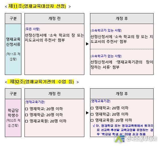 아울러, 20명 이하로 정해진 영재교육기관(영재학교, 영재학급, 영재교육원)의 ‘학급당 학생 수’를 영재학급 또는 영재교육원에서 원격으로 ‘선교육·후선발 교육과정’을 운영하는 경우에는 예외적으로 20명을 초과할 수 있도록 허용했다.