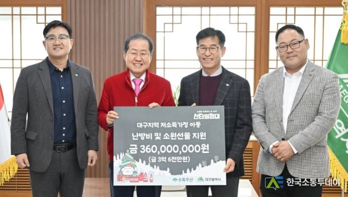 한국소통투데이 관리자 기자 | 홍준표 대구광역시장은 12월 8일 11시에 대구시청 산격청사에서 문희영 초록우산 어린이재단 대구지역본부장과 김규혁 대구후원회장 등 관계자가 참석한 가운데 ‘2023 초록우산 산타원정대 후원금’ 전달식을 가졌다.
