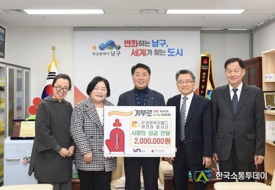 한국소통투데이 관리자 기자 | (사)무궁화복지월드 대연권 봉사단에서는 지난 6일 부산광역시 남구에 이웃돕기 성금 200만원을 전달했다.