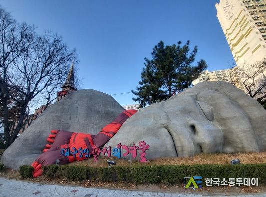 한국소통투데이 관리자 기자 | 대구 달서구는 10일부터 겨울을 맞아 지역의 랜드마크 조형물인 거대원시인에 달서구의 슬로건을 변형한 겨울맞이 문구와 함께 방한용품인 목도리 조형물을 설치해 따뜻한 겨울을 나길 기원하는 퍼포먼스를 진행 중이다.