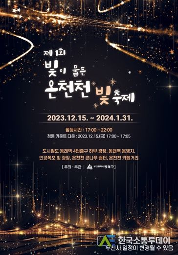 한국소통투데이 관리자 기자 | 부산 동래구는 온천천을 누구나 찾고 싶은 곳이자 겨울 에도 문화가 넘치는 새로운 공간으로 만들기 위해 올해 제1회 ‘빛이 물든 온천천 빛축제’를 개최한다고 밝혔다.