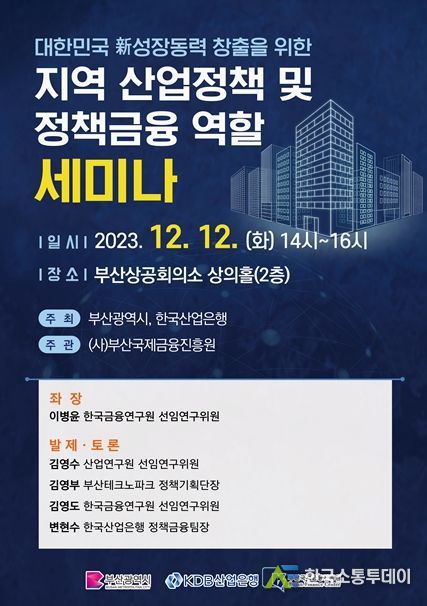 한국소통투데이 관리자 기자 | 부산시는 오늘(12일) 오후 2시 부산상공회의소 상의홀에서 한국산업은행과 '대한민국 신(新)성장동력 창출을 위한 지역 산업정책 및 정책금융 역할' 세미나를 개최했다고 밝혔다.