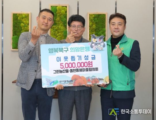 한국소통투데이 관리자 기자 | 그린농산물(대표 최정욱), 동천동새마을협의회(회장 박경민)는 12월 13일 북구 저소득층 지원을 위한 성금 500만원을 대구 북구청에 기탁했다.