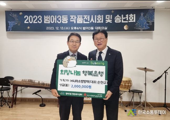 한국소통투데이 관리자 기자 | 대구 수성구 범어3동(동장 정병준)은 지난 12일 열린 ‘범어3동 작품전시회 및 송년회’ 행사에서 손현규 ㈜나라소방방재 대표가 어려운 이웃을 위해 성금 200만원을 기탁했다고 밝혔다.