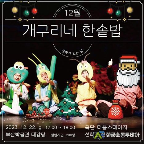 한국소통투데이 관리자 기자 | 부산시립박물관은 오는 12월 22일 오후 5시, 부산박물관 대강당에서 12월 문화가 있는 날 공연으로 '개구리네 한솥밥'을 개최한다고 밝혔다.