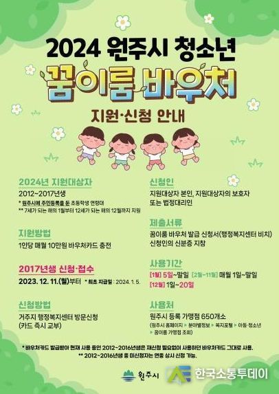 한국소통투데이 관리자 기자 | ‘2017년생’ 대상 원주시 청소년 꿈이룸 바우처 접수를 시작한 지 5일 만에 대상 인원의 33%인 910명이 신청을 마치며 학부모의 높은 관심을 확인할 수 있었다.