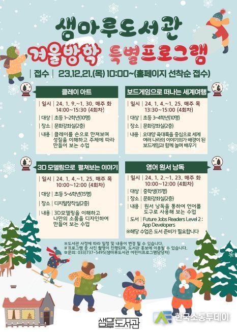 한국소통투데이 관리자 기자 | 원주시립샘마루도서관은 겨울방학을 맞이하여 어린이와 청소년의 도서관 이용과 독서의 생활화를 위해 겨울방학 특별 프로그램을 운영한다.