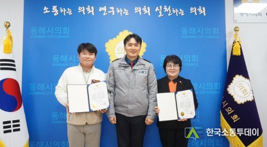한국소통투데이 관리자 기자 | 동해시의회 민귀희 의원과 박찬호 정책지원관은 12월 19일 오후3시, 동해시의회 의장실에서 이철희 동해경찰서장으로부터 감사장를 수여받았다.