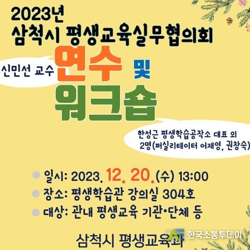 한국소통투데이 관리자 기자 | 삼척시는 관내 평생교육 기관·단체 관계자들을 대상으로 12월 20일 오후 1시 평생학습관 강의실에서 『2023년 삼척시 평생교육실무협의회 연수 및 워크숍』을 개최한다.