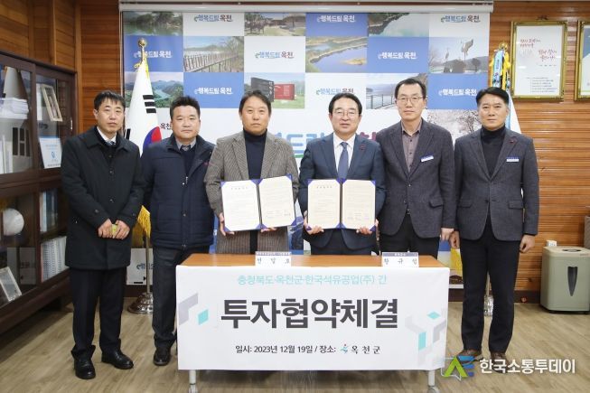 충청북도·옥천군·한국석유공업(주)는 19일 옥천군청 군수실에서 황규철 옥천군수와 한국석유공업(주) 관계자들이 참석한 가운데 청산산업단지에 대한 투자협약을 체결했다.