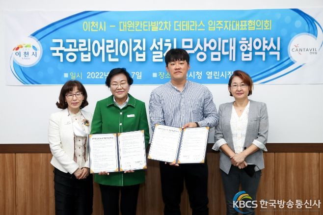 한국방송통신사 관리자 기자 | 이천시는 7일 송정동 대원칸타빌2차더테라스 아파트(303세대) 단지내 관리동을 국공립어린이집으로 설치·운영하기 위하여, 대원칸타빌2차더테라스 입주자대표협의회와 ‘어린이집 인수인계 및 관리운영 협약’을 체결했다.