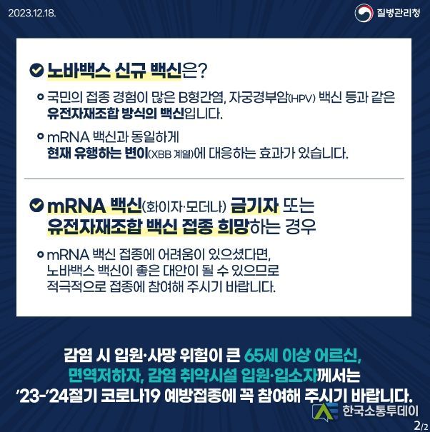 특히 지난 18일부터 시작된 노바백스XBB1.5 신규 백신은 국민의 접종 경험이 많은 B형간염이나 인플루엔자(독감) 백신 등과 같은 유전자재조합 방식의 백신으로 안정성이 입증됐다는 장점이 있다.
