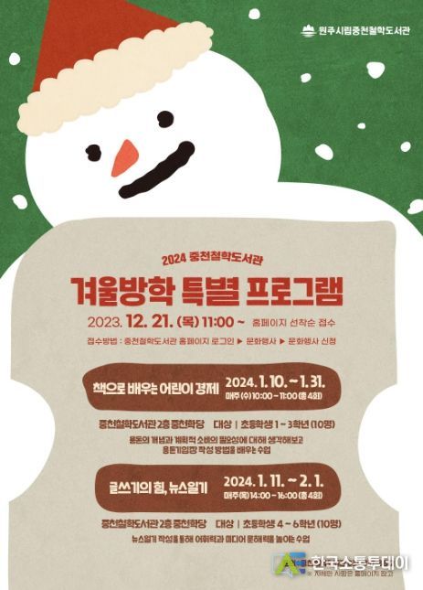 한국소통투데이 관리자 기자 | 중천철학도서관은 2024년 겨울방학을 맞이하여 관내 어린이를 대상으로 겨울방학 특별 프로그램을 운영한다.