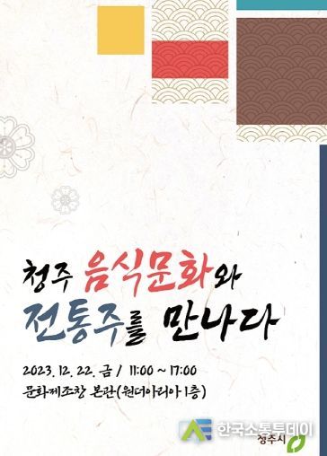 한국소통투데이 관리자 기자 | 청주시는 오는 22일 문화제조창 1층 원더아리아에서 식문화 체험행사, ‘청주 음식문화와 전통주를 만나다’를 개최한다고 밝혔다.