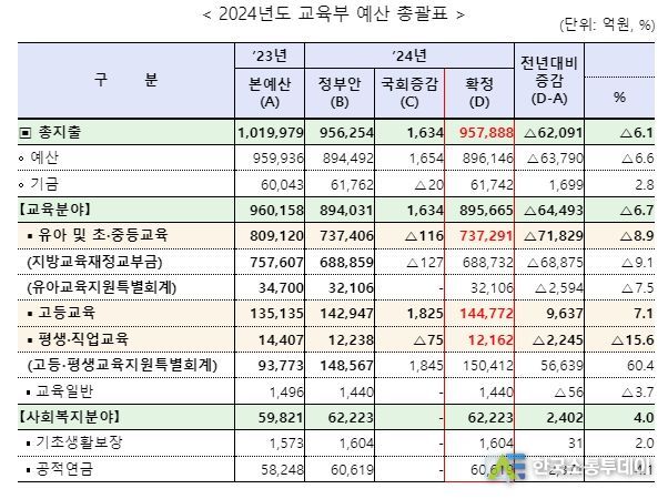 국회 심사과정에서 2024년 교육부 예산은 정부안 95조 6,254억원 대비 1,634억원 증액되어 95조 7,888억원으로 확정됐으며 주요 변동내용은 다음과 같다.