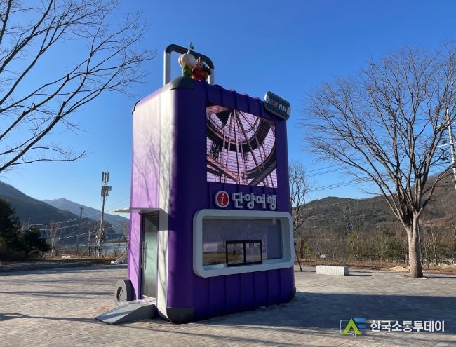 ‘단양여행가방’은 너비 4m, 높이 8m에 찐한 보라색이 눈에 띄는 대형 캐리어 모형 관광안내소로 단양 여행과 관련된 시기별, 장소별 인기 관광지와 교통, 식당 등 정보를 제공한다.