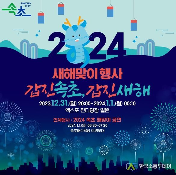 한국소통투데이 관리자 기자 | 속초시가 갑진년 ‘푸른 청용의 해’를 맞아 오는 12월 31일 저녁 8시부터 엑스포 잔디광장에서 2024년 속초 새해맞이 행사 ‘갑진속초, 갑진새해’를 개최하고 1월 1일 새해 아침 6시 30분에는 속초해수욕장 야외무대 일원에서 해맞이 공연을 연계 행사로 진행한다.