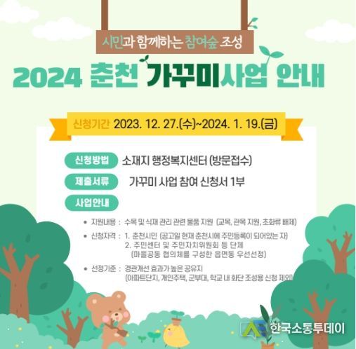 한국소통투데이 관리자 기자 | 춘천시가 27일부터 내년 1월 19일까지 가꾸미사업 대상자를 모집한다.