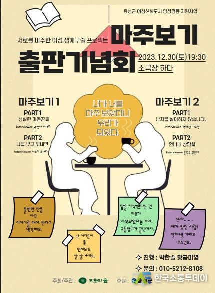 한국소통투데이 관리자 기자 | 음성군은 2023년 양성평등 공모사업으로 지원한 도토리숲 사회적협동조합의 '서로를 마주한 여성 생애구술 프로젝트 마주보기' 출판 기념행사를 30일 오후 7시 30분 생극면 ‘소극장 하다’ (생극면 음성로1619번길 38)에서 개최한다고 밝혔다.