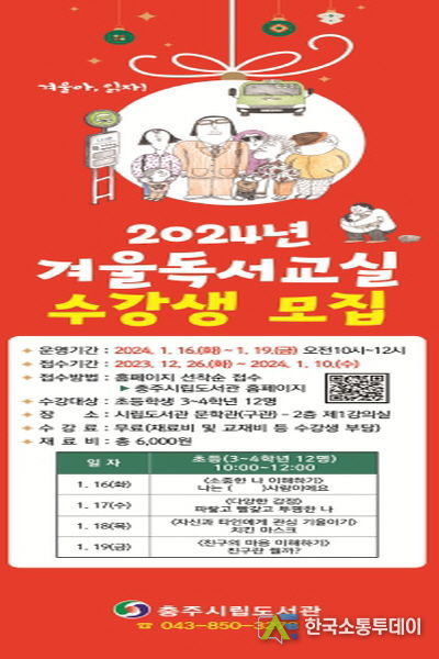 충주시립도서관의 겨울 독서교실 참여 희망자는 충주시립도서관 홈페이지를 통해 오는 1월 10일까지 신청하면 된다.