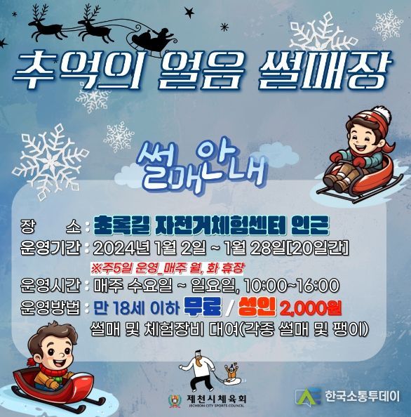 한국소통투데이 관리자 기자 | 제천시체육회는 겨울철 동절기 스포츠 활성화를 위해 하고자 오는 2024년 1월 2일(화)부터 1월 28일(일)까지 초록길광장 자전거체험센터 일원에서 추억의 얼음썰매장을 운영한다.