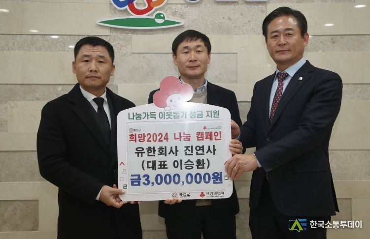 한국소통투데이 관리자 기자 | 홍천군 종합주류회사인 유한회사 진연사(대표 이승환)는 12월 27일 홍천군청을 방문하여 희망2024 나눔캠페인에 성금 300만원을 기탁했다.