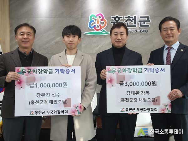 한국소통투데이 관리자 기자 | 홍천군청 직장운동경기부 태권도팀 김태완 감독과 강완진 선수는 12월 27일 홍천군청을 방문하여, 홍천군 인재육성을 위해 무궁화 장학금 400만원을 기탁했다.